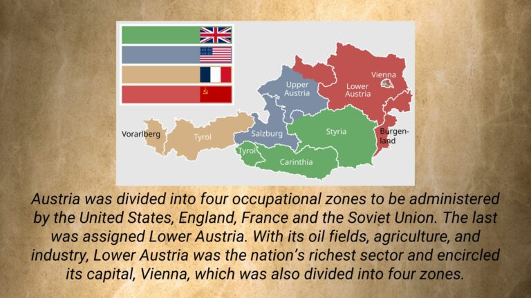 Like Germany, Austria was divided into four occupational zones to be administered by the United States, England, France and the Soviet Union. The last was assigned Lower Austria. With its oil fields, agriculture, and industry, Lower Austria was the nation’s richest sector and encircled its capital, Vienna, which was also divided into four zones.