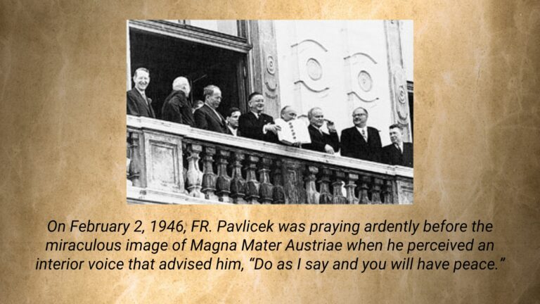 Their faith having been sufficiently tried, the grace was given. On March 24, 1955, their Soviet governors invited the Austrians to a conference. Believing that his nation’s future would be sealed in Moscow, Prime Minister Raab entreated Father Pavlicek before his departure, “Please pray, and ask your people to pray harder than ever.”