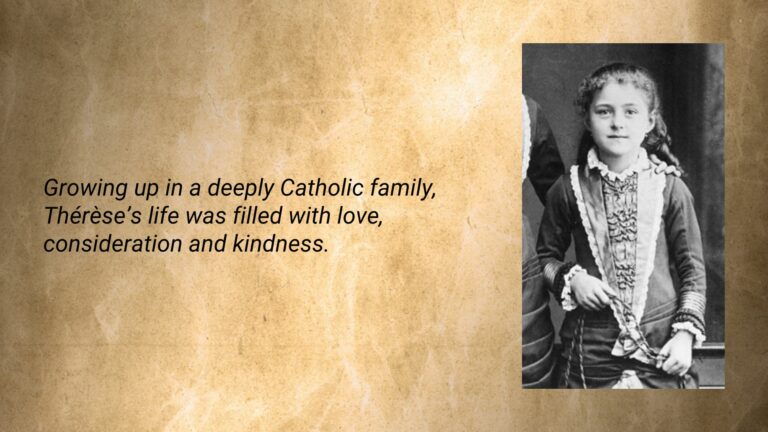 Growing up in a deeply Catholic family, Thérèse’s life was filled with love, consideration and kindness. A pretty, blond and blue-eyed girl, hers was a precocious mind, and passionate, willful, sensitive nature, a nature made yet more sensitive by her mother’s death of breast cancer when Thérèse was four.