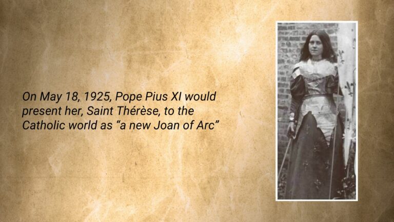 Saint Thérèse did not live to see Saint Joan’s canonization, and she was far from imagining that, on May 18, 1925, Pope Pius XI would present her, Saint Thérèse, to the Catholic world as “a new Joan of Arc”; and that during the Second World War, Pope Pius XII would declare her, like the Virgin of Orleans, “secondary patron of all France!”