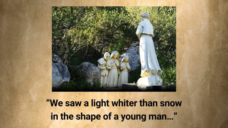 “We were playing for a while when suddenly a strong wind shook the trees, which led us to wonder what was happening, because the day was sunny. Then we saw in the distance a light whiter than snow in the shape of a young man about fifteen years old, of great beauty. We were surprised and excited. We could not utter a word. He approached us and said: ‘Do not be afraid. I am the Angel of Peace. Pray with me.’ And he knelt and touched the ground with his forehead.